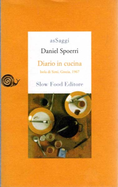 Spoerri, Daniel: Diario in cucina. Isola di Simi, Grecia, 1967. Traduzione di Massimo Fumagalli. Bra. Slow Food Editore. 2000. 21 x 13 cm. 160 S. OKarton mit OUmschlag. Sehr gutes Exemplar. asSaggi. Collana diretta Alberto Capatti. Italienische Ausgabe des „Gastronomischen Tagebuches“.