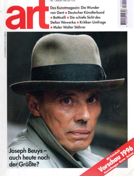 Beuys, Joseph: Joseph Beuys – auch heute noch der Größte? In: art. Das Kunstmagazin, Heft 1, Jabuar1996. Hamburg. Verlag Grun er + Jahr. 1996. 28 x 21 cm. 112 S. OKarton. Gutes Exemplar. Bericht über das „Netzwerk Joseph Beuys“, S. 14-27.