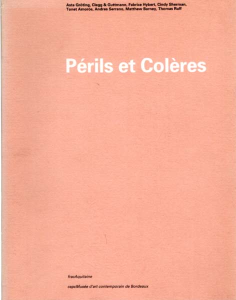 Perils et Coleres. Asta Gröting, Clegg & Guttmann, Fabrice Hybert, Cindy Shermann, Tonet Amoros, Andres Serrano, Matthew Barney, Thomas Ruff. Exposition du 22 mai au 6 septembre 1992. 1. Auflage. Bordeaux. capsMusee d´art contemporain de Bordeaux. 1992. 28 x 22 cm. 118 S. OKarton mit OUmschlag. Gutes Exemplar. Durchgehend mit farbigen Abbildungen versehen. Texte in Französisch.