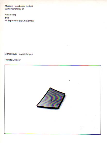 Sauer, Michel: Ausstellungen. Museum Haus Lange, Krefeld, 19. September bis 1. November. Erste Aufllage. Krefeld. Kaiser Wilhelm Museum der Stadt Krefeld. 1976. 23 x 17 cm. 32 unpaginierte S. OKarton. Einband minimal gedunkelt und mit kleinem Kleberückstand, hinterer Einband minimal knickspurig, sonst gutes Exemplar. Ausstellung 5/76. Mit einem Textbeitrag von Gerhard Storck. Enthält 36 s/w Abbildungen.