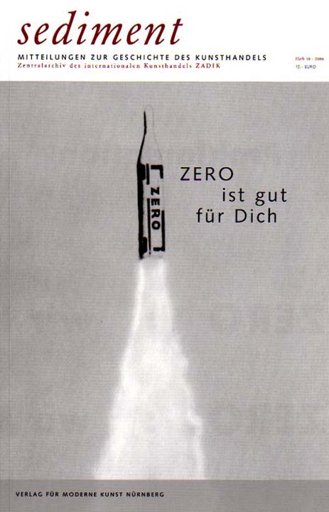 sediment. Mitteilungen zur Geschichte des Kunsthandels. Heft 10. Zero ist gut für Dich. Erste Auflage. Bonn. Zentralarchiv des Internationalen Kunsthandels e.V. 2006. 28 x 18 cm. 95 S. OKarton. Sehr gutes Exemplar. Erschien anläßlich der Ausstellung „ZERO ist gut für Dich“. Mit Beiträgen von Günter Herzog, Ulrike Schmitt und Brigitte Jakobs-van Renswou. Durchgehend mit SW-Abbildungen versehen.