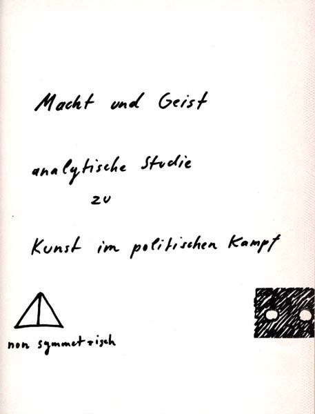 Penck, A. R.: Macht und Geist. Analytische Studie zu Kunst om politischen Kampf non symmmetrisch. Auflage 1500 Exemplare. Brussels. Pur ecrire la liberte. 1975. 27 x 21 cn. 36 unpaginierte S. OBrischur. Tadellos frisches Exemplar. Das Künstlerbuch erschien in einer Auflage von 1500 Exemplaren, davon 150 nummeriert und signiert. 1050 Exemplare wurden als künstlerischer Beitrag der Box „Saltoarte“ beigegeben, 450 gelangten in den freien Verkauf. Gedruckt auf Zeitungspapier. Hier ein Exemplar der normalen Ausgabe. Die vordere Umschlagseite hat einen kleinen quadratischen Ausschnitt, der den Blick auf die dahinter liegende kleine Würfelzeichnung frei gibt.