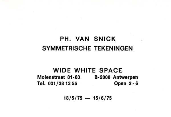 Van Snick, Philipe: Symmetrische Tekeningen. [Einladung] 18/5/75 – 15/6/75. Antwerpen. Wide White Space Gallery. 1975. 10,5 x 15,5 cm. 1 Blatt. OKarton-Karte. Sehr gutes, frisches Exemplar. Einseitig bedruckte Karte, verso vakat. [Vgl. Wide White Space – Behind the Museum, 1995. S.336, Nummer 98].