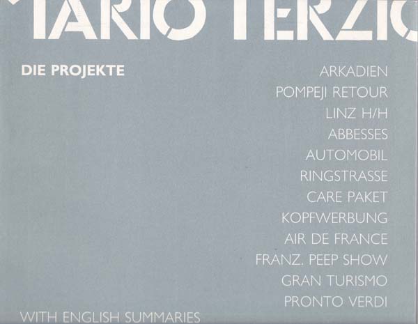 Terzic, Mario: Entwürfe für Stadt und Land. 1979 – 1989. Erste Auflage. ^Wien. Selbstverlag. 1989. 24 x 28 cm. 109 S. OKarton mit Klappenumschlag. Einbandkanten etwas lichtrandig und mit kleinen Bereibungen. Sonst gutes bis sehr gutes Exemplar. Durchgehend mit Abbildungen versehen.