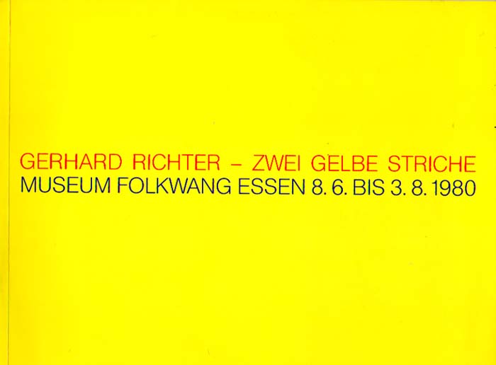 Richter, Gerhard: Zwei gelbe Striche. Museum Folkwang Essen, 8.6. bis 3.8.1980. Auflage 800 Exemplare. Essen. Museum Folkwang. 1980. 28 x 21 cm. 23 S. OKarton. Sehr gutes Exemplar. Mit einem Text von Tdenek Felix und duchgehenden Abbildungen. Unspektakulärer Katalog zu einer seinerzeit doch recht spektakulären Ausstellung Richters, beschränkt auf zwei Bilder.