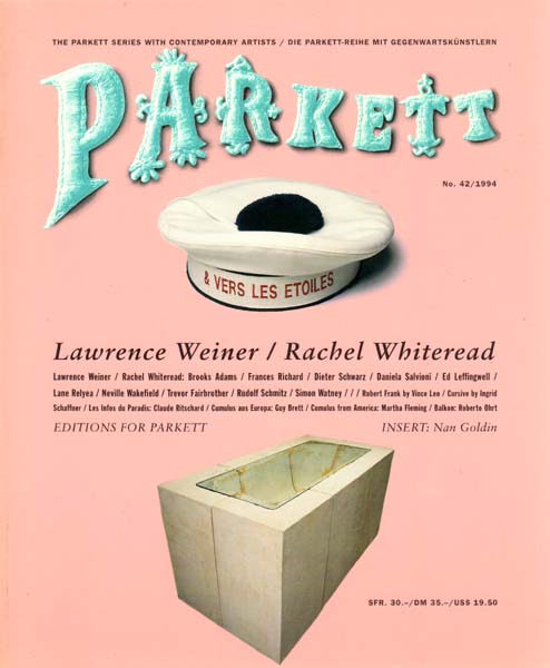 Parkett. Die Parkett-Reihe mit Gegenwartskünstlern / The Parkett Series with Contemporary Artists. Nummer 42 / 1994. Collaboration Lawrence Weiner / Rachel Whiteread. Herausgeber Peter Blum, Jacqueline Burckhardt, Bice Curiger, Dieter von Graffenried, Walter Keller. 1. Auflage. Zürich. Parkett Verlag. 1994. 26 x 21 cm. 167 S., 31 Blatt. OKarton. Hintere obere Stoßkante gestaucht, sonst gutes Exemplar. Parkett ist eine der renomiertesten und ambitioniertesten Kunstzeitschriften im deutschsprachigen Raum mit zunächst vierteljährlichem Erscheinen. Zu jeder Nummer erschien geleichzeitig eine Vorzugsausgabe mit Objekten, Grafiken oder Multiples der Künstler, die für die jeweilige Nummer zur Zusammenarbeit gewonnen werden konnten. Zu der breiten Vorstellung eines oder zweier Künstler (Lawrence Weiner / Rachel Whiteread), die auch gleichzeitig einen Originalbeitrag leisten – „Collaboration“ – kommen jeweils aktuelle Themen mit Bezug zur Zeitgenössischen Kunst, in diesem Heft u.a. Nan Goldin (Insert) Robert Frank etc.