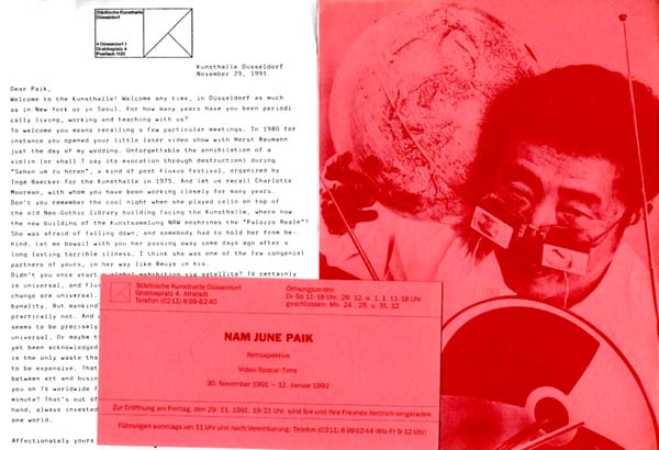 Paik, Nam June: Video Time – Video Space. Herausgegeben von Toni Stooss und Thomas Kellein. 1. Auflage. Ostfildern-Ruit. Edition Cantz. 1991. 28 x 22 cm. 141 S. OKarton mit OKlappenumschlag. Einband verso sehr wenig lichtrandig, sonst sehr gutes Exemplar. Katalog zur Ausstellungstour „Video Time – Video Space“, beginnend in der Kunsthalle Basel, 15. August bis 27. Oktober 1991 mit weiteren Stationen in Zürich, Düsseldorf und Wien. Mit zahlreichen Abbildungen und Texten. Beiliegend ein Flyer zur Ausstellung auf rosa Papier mit Foto Paiks, verso Erläuterungen, sowie die ebenfalls auf rosa Karton gedruckte Einladungskarte und ein faksimiliertes Anschreiben Jürgen Hartens an Nam June Paik anlässlich der Ausstellung.