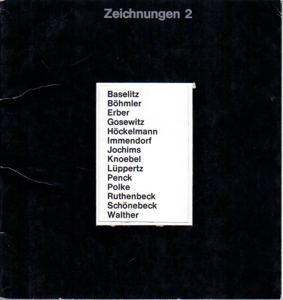 Wedewer, Rolf [Herausgeber]: Zeichnungen 2. Baselitz, Böhmler, Erber, Gosewitz, Höckelmann, Immendorf, Jochims, Knoebel, Lüppertz, Penck, Polke, Ruthenbeck, Schönebeck, Walther. Herausgegeben vom Städtischen Museum Leverkusen, Schloß Morsbroich. 10.11. 1972 bis 7.1.1973. Erste Auflage. Leverkusen. Städtisches Museum Leverkusen, Schloß Morsbroich. 1972. 21 x 21 cm. 119 unpaginierte S. OKarton mit quadratischer Ausstanzung auf beiden Einbanddecken. Einband berieben und etwas unfrisch, einige Kanten mit minimalen Knickspuren, sonst gutes Exemplar. Enthält durchgehend ganzseitige schwarz-weisse Abbildungen.