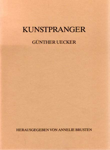Uecker, Günther: Kunstpranger. Wuppertal. Galerie Annelie Brusten. 1985. 23 x 17 cm. 49 S., 1 Blatt. OKarton mit OUmschlag. Umschlag etwas lichtrandig und angestaubt. Ordentliches Exemplar. Fotodokumentation der Aktion Kunstpranger.