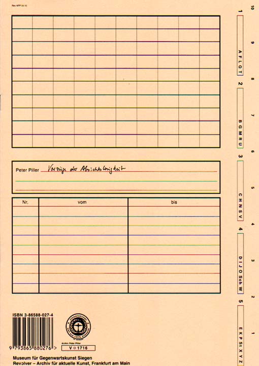 Piller, Peter: Vorzüge der Absichtslosigkeit. Museum für Gegenwartskunst Siegen, 15. Oktober 2004 – 30. Januar 2005. Ausstellung anlässlich der 5. Verleihung des Förderpreises zum Rubenspreis der Stadt Siegen an Peter Piller. Erste Auflage. Siegen / Frankfurt am Main. Museum für Gegenwartskunst Siegen / Revolver – Archiv für aktuelle Kunst. 2004. 31 x 22 cm. 14 S. (Katalogteil), [200] unpaginierte S. (Faksimile). 2 OBroschur in transparenter OKunststoffmappe. Tadelloses, neuwertiges Exemplar. Titel des Katalogteils handschriftlich von Peter Piller in Bleistift signiert. Enthält einen Katalogteil mit einem Vorwort von Peter Piller und einem Text von Eva Schmidt sowie 7 ganzseitigen s/w Abbildungen. Außerdem enthalten ist das Faksimile eines Notizblocks der Firma Carat Hamburg mit „Bürozeichnungen“ von Peter Piller.