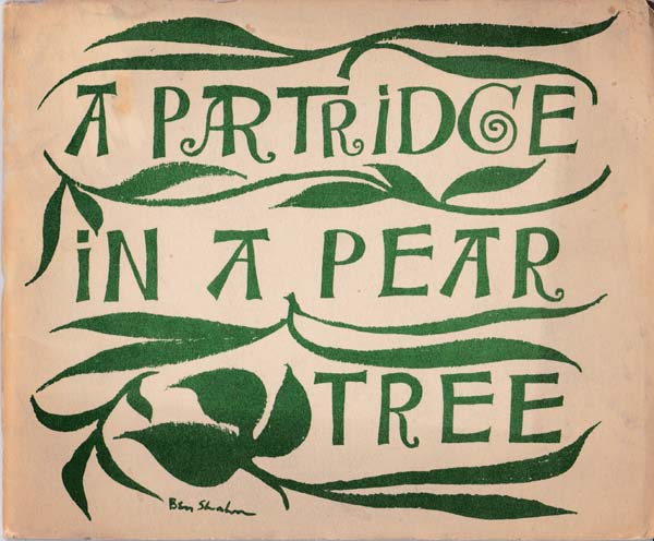 Shahn, Ben: A partridge in a pear tree. Zweite Auflage. New York. Curt Valentin. 1949. 18,5 x 22 cm. 32 unpaginierte S. Illustrierte OBroschur. Einband etwas nachgedunkelt und fleckig. Sonst gutes Exemplar. Illustrierte Ausgabe es Weihnachtslieds „A partridge in a pear tree“ durchgehend mit ganzseitigen Abildungen von Ben Shahn versehen. Text in englischer Sprache.
