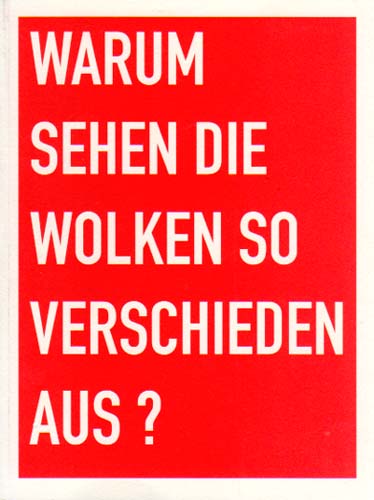 Blum, Heiner: Warum sehen die Wolken so verschieden aus? [Kunsthalle Mannheim, 4.12.1993 – 30.1.1994]. Erste Auflage. Mannheim. Städtische Kunsthalle Mannheim. 1993. 19 x 14 cm. 54 S., 27 Blatt. OKarton mit OKlappenumschlag. Rücken mit winzigem Fleckchen, sonst gutes Exemplar. Mit einem Vorwort von Manfred Fath sowie einem Beitrag von Pia Müller-Tamm. Durchgehend mit Abbildungen versehen, teilweise in Farbe.