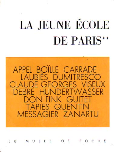 Lambert, Jean-Clarence: La jeune Ecole de Paris. Quinze reproductions. [Appel, Boille, Carrade, Laubies, Dumitresco, Claude, Georges, Viseux, Debre, Hundertwasser, Don Fink, Guitet, Tapies, Quentin, Messagier, Zanartu]. Erste Auflage. Paris. Musee de Poche / Editions Georges Fall. 1958. 19 x 14 cm. 60 S., 2 Blatt. OKarton mit OUmschlag. Unteres Kapital minimal bestoßen, Umschlag etwas angestaubt, sonst noch gutes Exemplar. Texte in Französisch. Enthält 15 montierte farbige Werkabbildungen. Auf dem Vorsatz als Besitzvermerk die Unterschrift des tachistischen schweizer Malers Rene Acht.