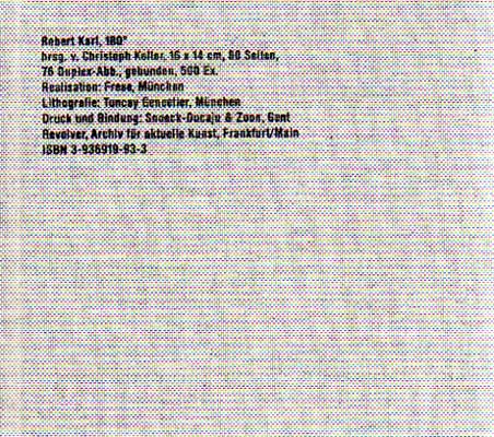 Karl, Robert – Christoph Keller [Herausgeber]: 180°. Auflage: 500 Exemplare. Frankfurt am Main. Revolver, Archiv für aktuelle Kunst. 2003. 15 x 17 cm. 80 S. OLeinen. Sehr gutes Exemplar. Enthält 76 Duplex Abbildungen
