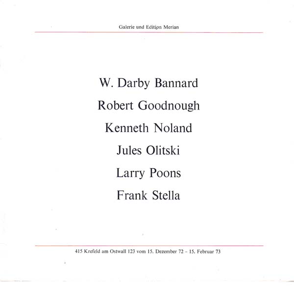 W. Darby Bannard. Robert Goodnough. Kenneth Noland. Jules Olitski. Larry Poons. Frank Stella. Erste Auflage. Krefeld. Galerie und Edition Merian. 19723. 20 x 21 cm. 24 unpaginiertte S. OBroschur. Einband etwas lichtrandig und mit kleinen Randbereibungen. Sonst gutes Exemplar. Katalog zur Ausstellung Krefeld 15. Dezember 1972 bis 15. Februar 1973. Mit Werkabbildungen von jedem Künstler sowie Bio- und Bibliographie und einem Text von Friedrich W. Heckmanns versehen.