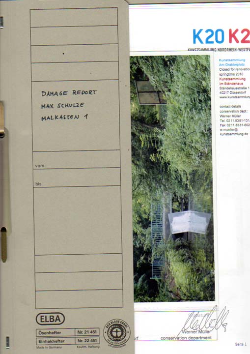 Schulze, Max: Damage Report 1 & 2. Dokumentation der Ausstellung „Parcours Interdit“, 15.06.08 – 20.07.08, Malkastenpark, Düsseldorf. Auflage: 50 nummerierte und signierte Exemplare. Düsseldorf. Selbstverlag. 2008. 30 x 24 cm. 7; 7 S., 3 Fotografien. 2 siebbedruckte Ösenhefter in OBriefumschlag mit montiertem Titelbild.. Tadelloses Exemplar. Eigenständige Faksimile-Edition in einer Auflage von 50 Exemplaren, hier die Nummer 49/50. Die signierten und nummerierten Exemplare bestehen aus zwei siebbedruckten Ösenheftern, 3 Fotografien der Ausstellung und jeweils einem sieben seitigen Zustandsprotokoll von Werner Müller. Gemeinsam mit den zerstörten Bildern wurde das Künstlerheft in der WG im Malkasten Düsseldorf präsentiert.