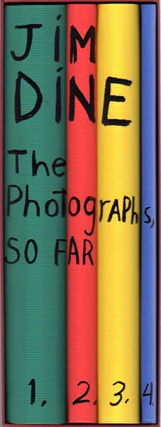 Dine, Jim: The Photographs, So Far. Davison Art Center, Wesleyan University Middletown CT – Maison Europeenne de la Photographie Paris. First edition.. Göttingen. Steidl. 2003. 30x 23 x 11 cm. 477; 198; 291; 78 S. Grünes, Rotes, Gelbes und Blaues OLeinen in OLeinen-Schuber. Sehr gutes Exemplar. Enthält: Band 1: Heliogravures; Band 2: Digital Prints; Band 3: Polaroids, Chromogenics, Gelatin Silver Prints; Band 4: Text. Durchgehend mit Abbildungen versehen. Textband in Englisch.
