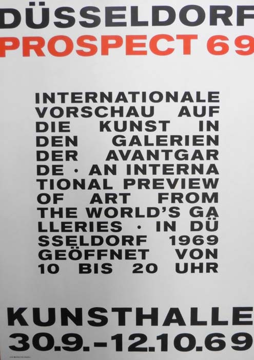 Prospect 69. [Plakat] Internationale Vorschau auf die Kunst in den Galerien der Avantgarde / An International Preview of Art from the World ´s Galleries in Düsseldorf 1969. 30. 9. – 12. 10.-69, Kunsthalle Düsseldorf. Düsseldorf. Städtische Kunsthalle Düsseldorf. 1969. 85 x 59 cm. Papier an den Rändern teils etwas knitterspurig, im oberen Rand etwas berieben und leicht fleckig, sonst gutes Exemplar. Typographisch gestaltetes Plakat, Druck in Rot und Schwarz, ungenutzt. Als Plakat selten.