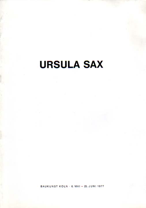 Sax, Ursula: Ursula Sax. Baukunst, Köln, 6. Mai – 25. Juni 1977. Erste Auflage. Köln. Baukunst. 1977. 30 x 21 cm. 16 S. OKarton. Einabd angestaubt, obere Stoßkante etwas knickspurig. Ordentliches Exemplar. Mit einem Text von Hermann Wiesler und 16 s/w Abbildungen.