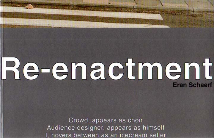 Schaerf, Eran: Re-enactment. Erste Auflage. Frankfurt am Main. Portikus. 1996. 19 x 29 cm. [66] S. OKarton mit OKlappenumschlag. Gutes Exemplar. Vordere Innenklappe mit handschriftlicher Widmung von Eran Schaerf in blauem Kugelschreiber, signiert, datiert Brussel 25.11.96. Durchgehend mit ganzseitigen Abbildungen versehen, teilweise in Farbe.