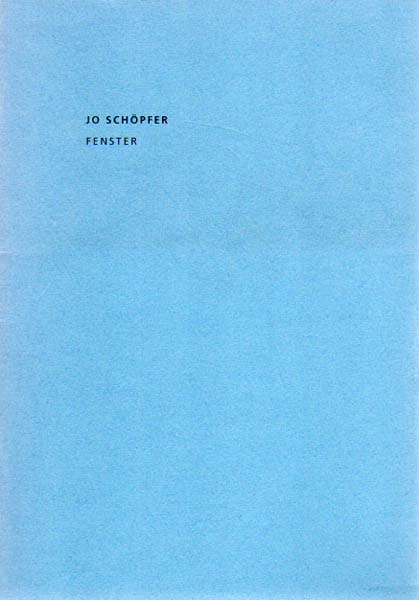 Schöpfer, Jo: Fenster. Kunstverein Heilbronn eV, 10. März bis 14. April 1996; Städtische Galerie im Museum Folkwang Essen. Erste Auflage. Heilbronn / Essen. Kunstverein Heilbronn eV / Städtische Galerie im Museum Folkwang Essen. 1996. 23 x 16 cm. 47 S. OKarton mit OKlappenumschlag. Umschlag minimal angestaubt, sonst sehr gutes Exemplar. Mit Textbeiträgen von Ellen Seifermann und Gerhard Finckh. Durchgehend mit meist farbigen Abbildungen versehen.