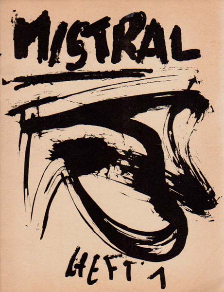 Mistral 1 – 3. Herausgegeben von Munser-Streifeneder. 1. Auflage. München. Chris-Verlag. 1963-1964. 27 x 21 cm. 32; 28; 28 unpaginierte S. OBroschur. Heft 1 ein Doppelbogen lose, Heft 2 am Umschlag etwas stockig, sonst sehr gutes Exemplar. Vollständige Folge, wohl auch mit allen Beilagen, des dem Tachismus nahe stehenden Magazins. Heft 1, März-Mai 1963, mit handschriftlich wiedergegebenen Texten und einigen Illustrationen; Heft 2, Juni – August 1963, gedruckte Texte, davon einer gezeichnet R. Wohlleben, sowie Illustrationen; Heft 3, November 1963 bis Januar 1964, mit einem lose beiliegenden Gedicht auf Faltblatt sowie einer lose beiliegenden Kopiegrafik auf lila Papíer, diverse Texte und Illustrationen. Erschien (wohl) in nur 300 Exemplaren.
