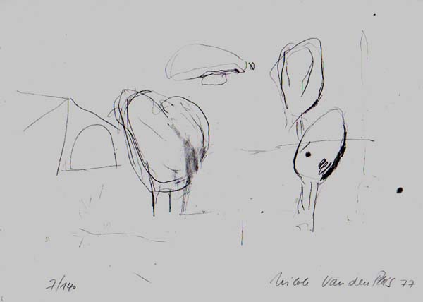Plas, Nicole van den: Ohne Titel. Lithographie. Lithographie, Nummer 7/140, unten rechts handschriftliche signiert und datiert 1977. 29,8 x 21,3 cm, feiner leicht grauer Karton.