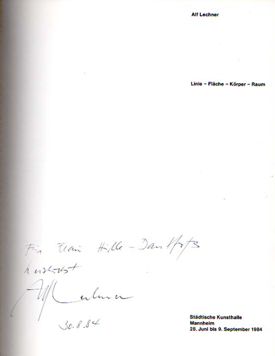 Lechner, Alf: Linie – Fläche – Körper – Raum. Städtische Kunsthalle, Mannheim, 28. Juni bis 9. September 1984. Erste Auflage. Mannheim. Städtische Kunsthalle. 1984. 27 x 21 cm. 55 S. OKarton. Gutes bis sehr gutes Exemplar. Titel mit einer handschriftlichen Widmung von Alf Lechner, signiert, datiert 30.8.84. Mit einem Vorwort von Manfred Fath und einem Beitrag von Joachim Heusinger von Waldegg. Durchgehend mit Abbildungen versehen, teilweise in Farbe.