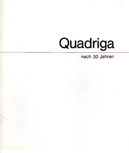 Quadriga nach 30 Jahren. Karl Otto Götz – Otto Greis – Heinz Kreutz – Bernard Schultze. Galerie Hans Ostertag, Frankfurt, November 1982 bis Januar 1983. Erste Auflage. Frankfurt. Galerie Hans Ostertag. 1982. 24 x 20 cm. 24 S. OKarton. Einband minimal lichtrandig. Gutes Exemplar. Enthält Texte von Hans Ostertag, Manfred de la Motte, Friedhelm Häring, Günther Ladstetter, Heiner Stachelhaus und Rene Hinds. Mit 8 Abbildungen, davon 4 in Farbe.