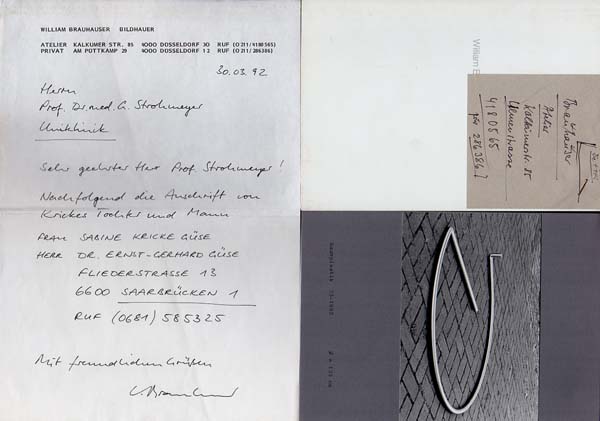 Brauhauser, William [und] Frank Mau: William Brauhauser / Frank Mau. Preisträger der von der Sparkasse gestifteten Ida Gerhardi Preise 1992, Museen der Stadt Lüdenscheid, 10. Dezember 1993 – 17. Januar 1994. 1. Auflage. Lüdenscheid. Museen der Stadt. 1993. 21 x 15 cm. 63 S. OKarton. Adresse des Künstlers Brauhauser an den voredern Umschlag getackert, sonst gutes Exemplar. Beiliegend eine Preisliste, ein montiertes Foto einer Plastik, drei handschriftliche Briefe von William Brauhauser auf dessen Briefpapier. Auf dem vorderen Umschlag in der Schrift des Künstlers ein Notizzuettel mit dessen Adresse.
