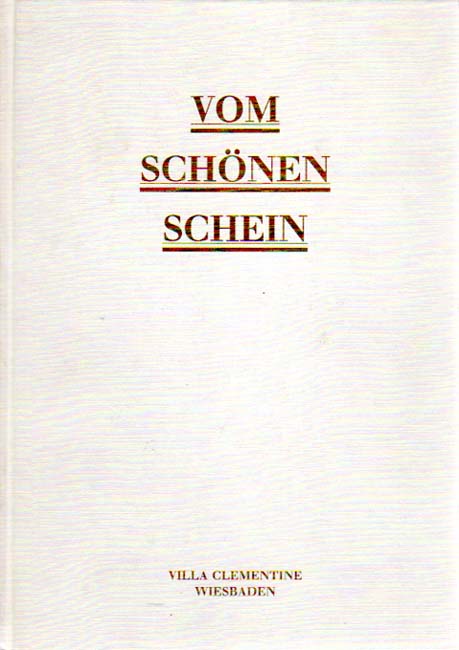 Vom schönen Schein. Michael Buthe – Georg Dietzler – Stephan Huber – Urs Lüthi – Adolf Luther – Stefan Pietryga – Michael Post – Norbert Prangenberg – Vera Röhm – Chihiro Shimotani – Wolfgang Sykownik – Volker Tannert – Jindrich Zeithamml. Villa Clementine, Wiesbaden, 30.4. – 2.7.1989. Erste Auflage. Wiesbaden. Villa Clementine. 1989. 24 x 17 cm. 48 unpaginierte S. OPappband. Einband etwas angestaubt, sonst gutes Exemplar. Mit einem Vorwort von Hannes Hake und einem Text von Marianne Hoffmann. Enthält 13 montierte und meist farbige Abbildungen.