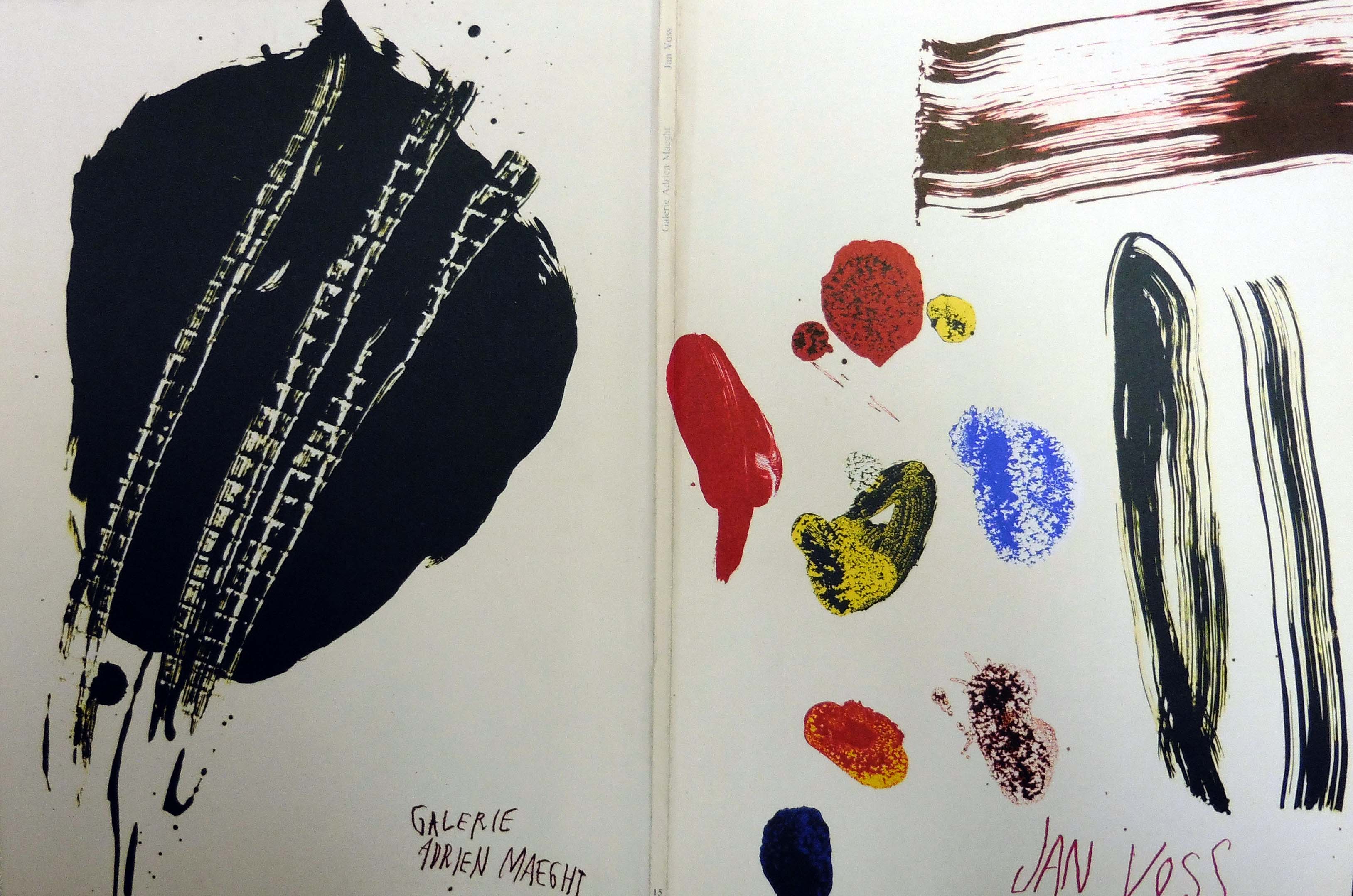 Voss, Jan: Jan Voss. Preface de Marie Luise Syring. Erste Auflage. Paris. Galerie Adrien Maeght. 1983. 33 x 25 cm. 28 S. (7 lose Bögen). OKarton (OLithographie). Einband minimal lichtrandig, sonst sehr gutes Exemplar. Text in Französisch. Mit 19 farbigen Abbildungen und 5 farbigen Original-Lithographien auf 4 Doppelbögen, inklusive dem Einband.