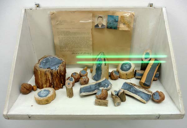 Badura, Michael: Blei – Mutanten 1970. Kunststoff-Hülle angeplatzt, Papier gebräunt, weiße Lackierung etwas staubschlierig. Objekt in gutem Zustand mit leichten zeitbedingten Spuren. Objektkasten, weiß lackiertes Holz, Metallstiffte und Glasscheibe. Enthält mit Blei gefüllte Hasel- und Wallnüsse, Holzscheiben und Holzblöcke etc. als Formen von vorgefundenen Verbleiungen analog vorgefundenen Versteinerungen. Mit einem – fiktiven – Text Baduars als Erläuterung in transparenter Kunststoffhülle an der Rückwand montiert neben drei Fotos. Die Anzahl der mit Blei gefüllten Objekte ist 27. Objektmaße: 38 cm Höhe, 50 cm Breite, 29 cm Tiefe.Unikate Arbeit, 1970, auf dem Schreiben datiert und signiert.