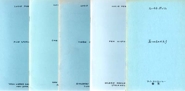 Pozzi, Lucio: Five Stories / Cinq Recits / Cinque Racconti / Fem Historier / Gosatsu no Monogatari. Erste Auflage. 5 Bände. New York / Paris / Turin / Stockholm / Tokyo. John Weber Gallery / Yvon Lambert / Gianenzo Sperone / Art Agency. 1974. 21 x 14 cm / 21 x 15 cm. Jeweils [20] unpaginierte S. OKarton. Einbände der japanischen und italienischen Version lichtrandig und leicht angestaubt, bei der englischen, schwedischen und französischen Version lediglich im Bereich des klammergehefteten Rückens etwas lichtschattig. Sonst gute Exemplare. Durchgehend ohne Abbildungen. Texte einer Kurzgeschichte in Englisch / Französisch / Italienisch / Schwedisch / Japanisch. Enthält jeweils einen handschriftlichen Text in der jeweiligen Sprache auf 10 bedruckten Seiten. Lucio Pozzi (* 1935 in Mailand) ist ein italienisch- US-amerikanischer Maler und Konzeptkünstler.