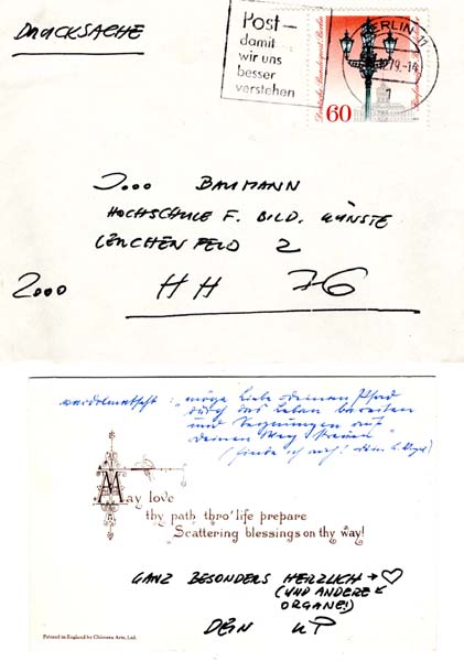 Brehmer, K. P.:: Neujahrsgrüße. 29,5 x 21,0 cm. 1 Blatt. OKarton-Postkarte in Kuvert. Sehr gutes Exemplar. Neujahrsgrüße K. P. Brehmers an Jo Baumann mittels einer Grußkarte (Wohlsituierter Bube hilft einem Mädel in Schlittschuhe an einem zugefrorenen Teich, 8 x 12 cm, England um 1900 – „A Glad New Year“). Diese verso mit einem gedruckten englischen Wünschezitat, welches wiederum von alter Hand in blauer Tinte in altdeutscher Schrift ins Deutsche übersetzt ist. Darunter handschriftliche Grußworte von Brehmer an Jo Baumann in schwarzer Tinte: „Ganz besonders herzlich (und andere Organe!) dein K.P.“ Postalisch versandt am 18.12.1979 in adressiertem Briefumschlag an Jo Baumann, Hochschule für Bildene Künste Hamburg, verso Adresstempel K. P. Brehmers. (Jo, das ist Jo(hanna) Baumann, damals Chefsekretärin beim damaligen Direktor der Hochschule für Bildende Künste in Hamburg, Carl Vogel. K. P. Brehmer war ab 1971 Professor an der Hochschule für Bildende Künste.
