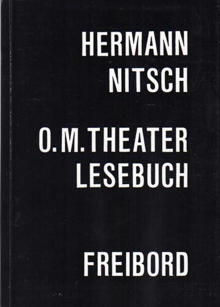 Nitsch, Hermann: O. M. Theater-Lesebuch. Zweite Auflage: 1000 Exemplare. Wien. Freibord Verlag. 1985. 23 x 17 cm. 939 S. 2 Blatt. OKarton. Leichte Gebrauchspuren. Gutes Exemplar. Freibord Sonderreihe ; Nr. 17. Eins von 1000 Exemplaren der zweiten Auflaget. Enthält theoretische Schriften, Partituren zu aufgeführten und unaufgeführten Aktionen sowie weitestgehend ausgeführte Partiturentwürfe zum 6-Tage-Spiel des Orgien Mysterien Theaters.