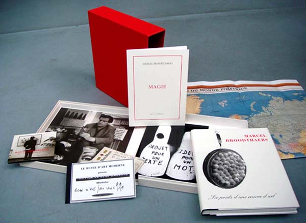 Broodthaers, Marcel: Tinaia 9 Box I. Edited by Wilfried Dickhoff. Köln. Tinaia 9 Verlags GmbH. Publisher Heinrich Nicolaus. 1994. 32 x 32 cm. Buch 1: 284 S. 3Bl.; Buch 2: (26 unpaginierte Bl.); Buch 3: 22 S. 1 Bl. OLeinen mit ilustriertem OUmschlag; OKarton mit ilustriertem OUmschlag (in OLeinenkassette mit OLeinen-Schuber). Rücken minimal nachgedunkelt, Box teils etwas angestaubt, sonst sehr gutes Exemplar. Erste Ausgabe in 1500 Exemplaren. Die Box (weiße Leinenkassette in rotem Leinenschuber) enthält: Marcel Broodthaers. „Le poids d´une oeuvre d`art“. Edited by Wilfried Dickhoff. Text in Deutsch und Englisch. Mit zahlreichen, oft farbigen Abbildungen; Marcel Broodthaers. Projets including Twenty Drawings. Edited by Wilfgried Dickhoff; Marcel Broodthaers. Magie. Art et Politique; 1 Carte du monde poetique (mehrfach faltbare Weltkarte); Le musée d´Art modern ( Quittungsblock König – Pilsner mit Skizzierungen von Broodthaers – faksimiliert); Le musée d´Art modern presente un film de Rene Margritte; Marcel Broodthaers. Interview with Freddy de Vree. Bruxelles / Düsseldorf 1969, 1971,1974.(CD in Pappklappcover). Übersichtskarte zur Box.