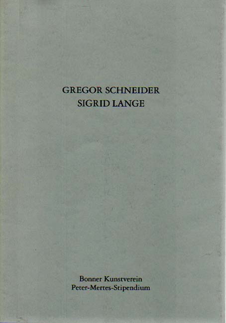 Schneider, Gregor [und] Sigrid Lange: Gregor Schneider / Sigrid Lange. Bonner Kunstverein, Peter-Mertes-Stipendium 1996. Erste Auflage. Bonn. Bonner Kunstverein. 1996. 23 x 16 cm. 2 OBroschur in OKarton-Mappe. Gutes bis sehr gutes Exemplar. Mit einem Text von Annelie Pohlen. Enthält insgesamt 14 Abbildungen, davon 4 in Farbe. Erschien anläßlich der Ausstellung „Gregor Schneider / Sigrid Lange“, Peter-Mertes-Stipendium 1996, 28.10.1996 bis 24.11.1996.