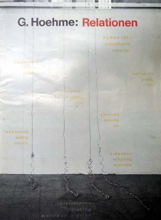 Hoehme, Gerhard: Relationen. [Sehen ist: abmessen, abtasten, einfühlen, ablesen, absuchen, erkennen, relativieren]. Erste Auflage. [Düsseldorf]. Selbstverlag. [1966]. 41 x 30 cm. 10 unpaginierte S. (inklusive Einband). OBroschur. Gutes Exemplar. Selbstverlegtes Künstlermagazin von Gerhard Hoehme, gestaltet mit den Farben Schwarz, Rot und Gelb. Texte in Deutsch, Englisch und Französisch. Mit 18 Abbildungen.
