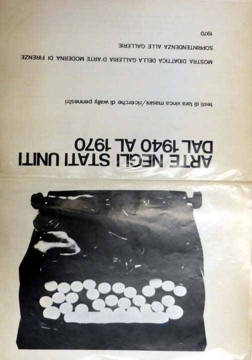 Arte negli stati uniti dal 1940 al 1970. Testi di Lara Vinca Masini / Ricerche di Wally Pennestri. Erste Auflage. Firenze. Galleria d`Arte Moderna. 1970. 50 x 36 cm. 19 paginierte Blatt. OBroschur (gefaltet). Papier etwas nachgedunkelt, Einband mit einigen Randläsuren und ca. 4 cm großem Einriss am Rücken. Ordentliches Exemplar. Kunst in den Vereinigten Staaten von 1940 bis 1970. Texte in Italienisch. Ohne Abbildungen.
