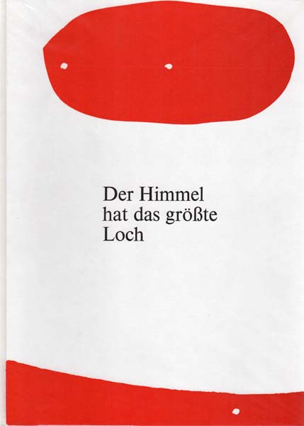 Prangenberg, Norbert – Rolf Steiner: Der Himmel hat das größte Loch. Gedichte Rolf Steiner. Linolschnitte Norbert Prangenberg. Auflage 100 numerierte Exemplare. Krefeld. Klaus Ulrich Düsselberg. 1985. 40 x 29 cm. 40 unpaginierte S. OPappband mit einem umlaufenden farbigen OLinolschnitt. Sehr gutes, frisches Exemplar. Nummer 27 / 100 handschriftlich im Kolophon nummerierten und von Künstler und Autor signierten Exemplaren, datiert Oktober 1985. Hangesetzt auf der Times Antiqua und gedruckt auf Zerkall Bütten von Rolf Steiner und Norbert Prangenberg zusammen mit Klaus Ulrich Düsselberg in der Druckwerkstatt Düsselberg Krefeld. Enthält inklusive dem Einband 9 Original-Linolschnitte, davon 6 in Schwarz und 3 in Rot.