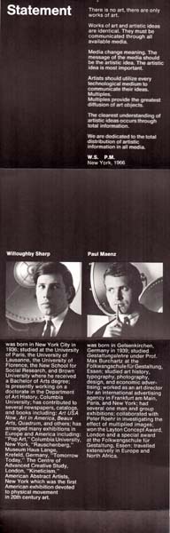 Sharp, Willoughby / Paul Maenz: Kineticism Press. Program / Statement. New York. Kineticism Press. 1966. 14 x 14 cm. 10 unpaginierte S. OKarton-Leporello. Sehr gutes, frisches Exemplar. Werbeleporello der „Kineticism Press“ von 1966. Enthält auf der einen Seite ein formuliertes Programm – Books, Catalogs, Exhibitions, Radio and Television, Multiples – und auf der Frontseite ein Statement der beiden Herausgeber: „There is no art, there are only works of art. Works of art and artistic ideas are identical. They must be communicated through all available media…“. Ausgefaltet 14 x 70 cm. Angekündigt sind Projekte mit sowie Multiples und Bücher von Yves Klein, Günther Uecker, Otto Piene, Peter Roehr, Castellani, Soto und Takis. Beiliegend eine Visitenkarte von Willoughby Sharp.