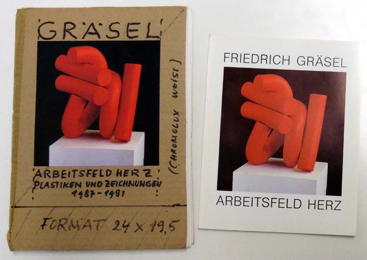 Gräsel, Friedrich: Arbeitsfeld Herz. Plastiken und Zeichnungen 1987 bis 1991. Landesversicherungsanstalt Westfalen, Bad Salzuflen, Salzetalklinik, 13. März bis 14. Juni 1992; Ennepetal, Klinik Königsfeld, 21. Juni bis 19. September 1992. Erste Auflage. Münster. Landesversicherungsanstalt Westfalen. 1992. 24 x 20 cm. 60 S. OKarton. Gutes bis sehr gutes Exemplar. Mit Texten von Wilhelm Riehemann, Ulrich Schneider, A. Hinrich Murken und Harald Hartung. Durchgehend mit meist farbigen Abbildungen versehen. Dabei: Vollständiger Original-Dummy des Kataloges, durch den Künstler bearbeitet und zusammengestellt. 60 lose Blatt in Wellpappe-Umschlag, durchgehend betitelt, teils korrigiert und überarbeitet. Die Abbildungen teils in Farbkopien, meist schwarz-weiss. Mit Adressstempel des Künstlers.