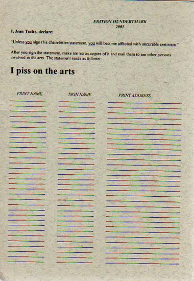 Toche, Jean: I piss on the arts. Erste Auflage. Köln. Edition Hundertmark. 2001. 21 x 15 cm. 16 unpaginierte S. OKarton. Sehr gutes Exemplar. 43. Heft der Edition Hundertmark. Text in Englisch / Text English.