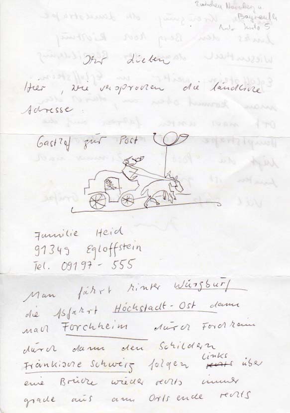 Nattermüller, Ulrike: Handschriftlicher Brief. 30 x 21 cm. 1 Blatt. Gefaltet, sonst sehr gutes Exemplar. Handschriftlicher zweiseitiger Brief mit einer kleinen Zeichnung in polstalisch gelaufenem Umschlag, signiert „Ulrike“, 1998. Dabei 3 Einladungen der Galerie Erhard Klein sowie eine des Städtischen Musem Abteiberg, Mönchengladbach.