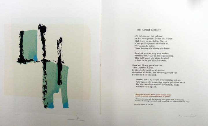 Grimm, Arty – Cees Nooteboom: De Dichter en de Dingen. Cees Nooteboom – gedichten. Arty Grimm – zeefdrukken. Auflage: 180 nummerierte Exemplare. Uden. Sandoz B.V. 1986. 50 x 40 cm. 6 lose Bögen mit Umschlag, 2 lose Blatt. OLeinen-Kassette. Kolophon an der rechten unteren Kante minimal knickspurig, sonst sehr gutes Exemplar. OLeinen-Kassette mit 6 lose innenliegenden Bögen mit Umschlägen, jeweils mit einem Original-Siebdruck und einem Gedicht. Jeder Siebdruck handschriftlich von Grimm signiert und nummeriert, jedes Gedicht handschriftlich von Nooteboom signiert. Ausserdem innenliegend: Einleitung von Cees Nooteboom und Kolophon. Der Kolophon von Nooteboom und Grimm handschriftlich signiert und nummeriert, hier die Nummer 162 von 180 Exemplaren. Texte in Niederländisch. Erschien anläßlich des 100 jährigen Bestehens der Sandoz A.G. in der Schweiz.