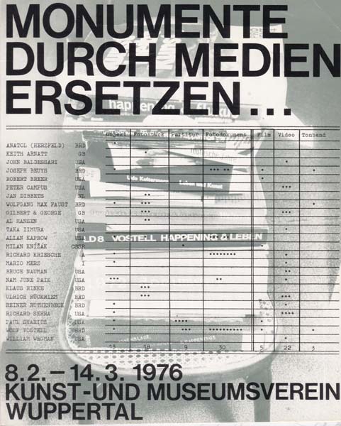 Monumente durch Medien ersetzen. Erste Auflage. Wuppertal. Karlsruhe. Kunst- und Museumsverein. Badischer Kunstverein e.V. 1976. 26 x 21 cm. 52 unpaginierte S. Illustrierte OBroschur. Einbandkanten mit kleinen Bereibungen, etwas lichtrandig. Gutes Exemplar. Katalog zu den Ausstellungen Wuppertal 8. 2. bis 14. 3. 1976 und Karlsruhe 21. 4. bis 30. 5. 1976 durchgehend mit s/w-Abbildungen versehen, darunter Werke von Joseph Beuys, Thomas Schmiit, Wolf Vostell, Al Hansen u.a. Text von Johann Heinrich Müller.