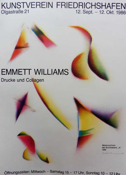 Williams, Emmett: Drucke und Collagen. [Plakat] Metamorphosis des Buchstabens „A“ 1986. Kunstverein Freiburg, 12. September – 12. Oktober 1986. Freiburg. Kunstverein. 1986. 84 x 60 cm. 1 Blatt. Sehr gutes Exemplar. Farbiger Offsetdruck. Von Emett Williams handschriftlich in Bleistift signiert und datiert 1986.