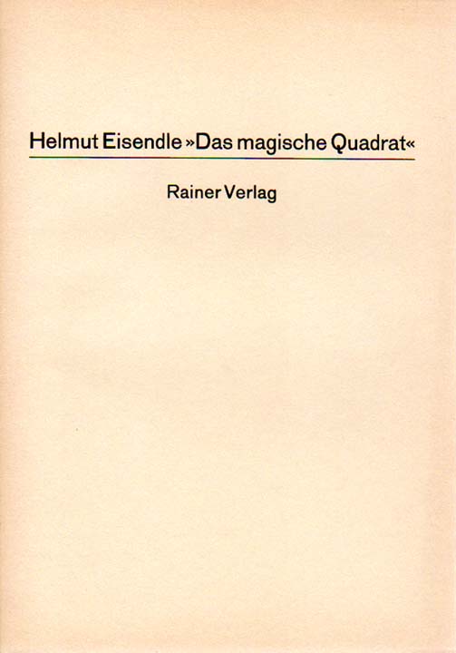 Eisendle, Helmut: Das magische Quadrat. Auflage: 150 nummerierte und signierte Exemplare. Berlin. Rainer Verlag. 1990. 30 x 21 cm. 28 unpaginierte S., 1 loses Blatt. OEnglisch-Broschur. Hinterer Umschlag aufgetrennt, sonst gutes Exemplar. Im Impressum handschriftlich nummeriertes und von Helmut Eisendle signiertes Exemplar, hier die Nummer „ANSICHTSEXEMPLAR“ von 200. Mit dem Beiblatt „Magische Quadrate einfacher Ordnung“.