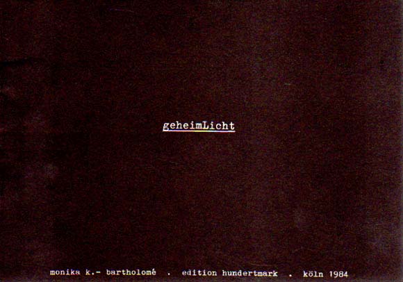 Bartholome, Monika K.: geheimLicht. Auflage: 500 Exemplare. Köln. Edition Hundertmark. 1984. 15 x 21 cm. 16 unpaginierte S. OKarton. Gutes bis sehr gutes Exemplar. 15. Heft der Edition Hundertmark. Künstlerbuch von Monika Bartholome. Durchgehend mit ganzseitigen schwarz-weiß Abbildungen versehen.